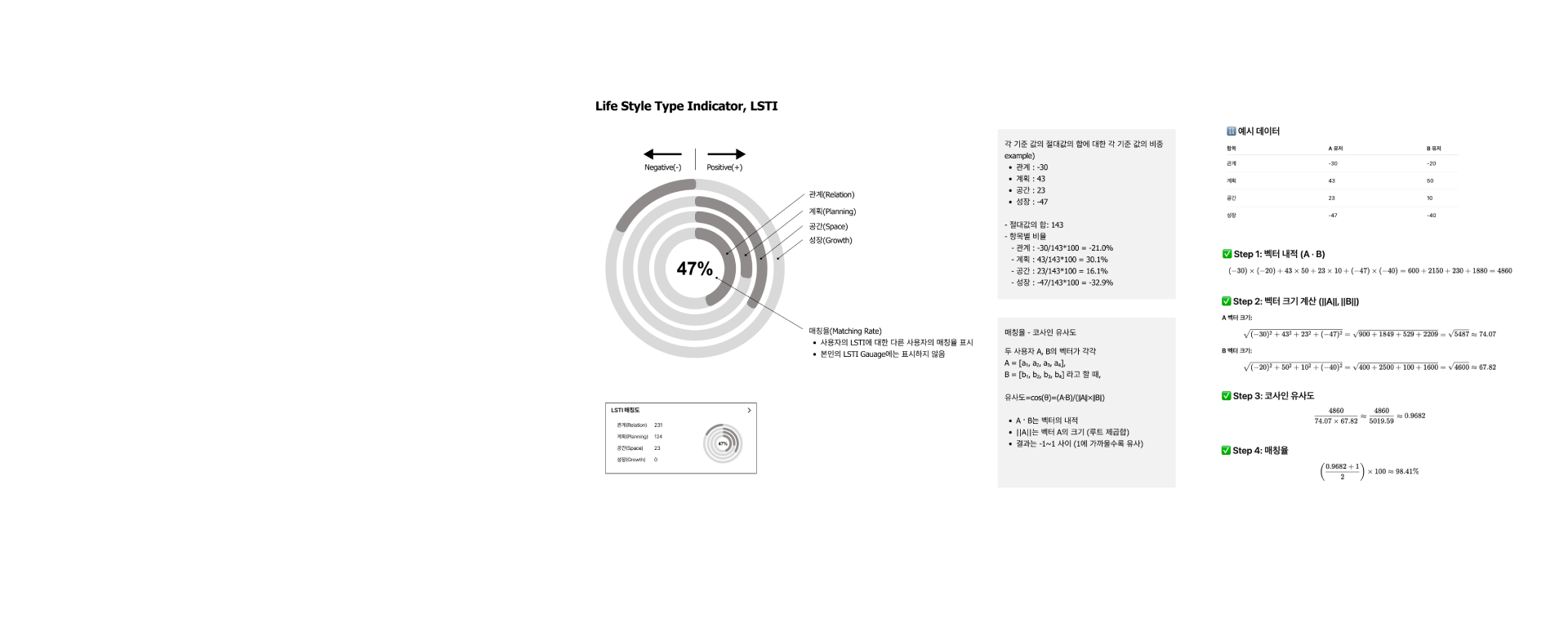 LSTI(LifeStyle Type Indicator)는 사용자의 활동 데이터를 기반으로 라이프스타일 성향을 구조적으로 모델링하는 지표입니다. 즉, MBTI처럼 성격을 분류하는 것이 아니라, 사용자가 어떤 방식으로 삶을 살아가는지를 행동 패턴 중심으로 이해하고 설명하기 위한 시스템입니다.